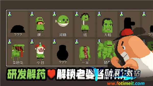 想知道怎么养成怪物老婆吗?《怪物老婆养成记》这款游戏能满足你!在游戏里,玩家的老婆突然变成了怪物,你要踏上寻找解药的冒险之旅。玩法超丰富,能探索像素世界收集材料研发疫苗,对抗敌人解锁各种僵尸老婆形态并收集,还能强化装备与角色。通过破坏场景收集零件修复发电机和疫苗研发机器,升级它们后用生产出的金币和药丸研发疫苗并试验。这里有精美的卡通画风、搞笑剧情,还有很多隐藏秘密等你发现。与NPC对话或许能得到通关技巧。挣钱也不难,比如用苹果和NPC换钱、银行投资、找嗑药小哥、利用保险箱等。伺候好老婆,升级机器,解锁全部老婆形态,就能让老婆变回原样。快来下载体验,开启这场特别的养成冒险吧!