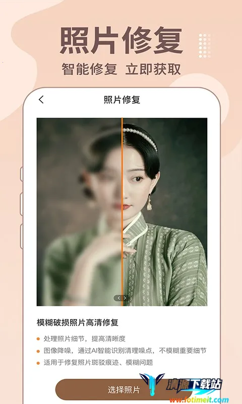 老照片修复王是一款超实用的手机照片修复软件。它功能强大,能解决不少老照片的问题。比如照片因时间久变得模糊不清,用它的照片修复功能就能自动修复并提高清晰度。要是想给黑白照片上色,基于AI技术一键就能搞定,还原符合场景的色彩。它不仅能修复,还是照片编辑神器,能一键生成专属漫画脸,满足你的创意需求。还有性别转换功能,能让你看到平行时空另一个性别的自己。操作简单,支持多种格式照片快速恢复,还能智能获取最佳修复模板。基于强大的AI图像处理技术,能极大程度还原照片内容背后的故事,把残破、不清晰的老照片修复成清晰模样,让你重温那份美好,真的很不错,值得试试。
