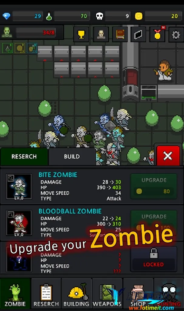 3. 丰富内容元素:拥有多种类型的僵尸,如外星人僵尸、特大僵尸、表彰僵尸等,还有各种变异僵尸和研究所,可唤醒僵尸学习特殊能力,建立僵尸部队打猎,开发古代遗迹提升僵尸能力。