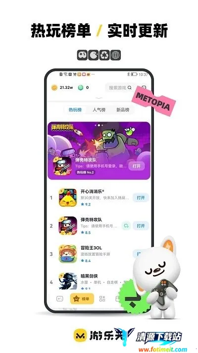 游乐元游戏盒子安卓版手机版亮点满满。它拥有海量热门好玩的游戏,涵盖各类游戏类型,能让你轻松找到感兴趣的游戏并下载畅玩,乐享游戏时光。通过启动任意游戏产生的时长可开启宝箱获金币奖励,免费兑换游戏豪礼。还设有多格局游戏榜单,由千万网友在线评分,帮你轻松找到高人气游戏。此外,所有游戏安装包经双重审核,无多余插件,放心下载。热门榜单实时更新,不断为你推送好玩的游戏。