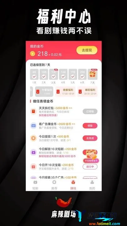 麻辣剧场2026官方正版是一款短剧播放软件,汇集海量资源,涵盖多种题材,免费观看无广告。每日上新,依用户喜好推荐。支持竖屏全屏、倍速调节,有实时榜单,界面简洁,看剧还能赚零花钱。