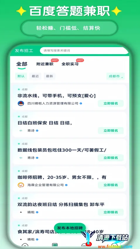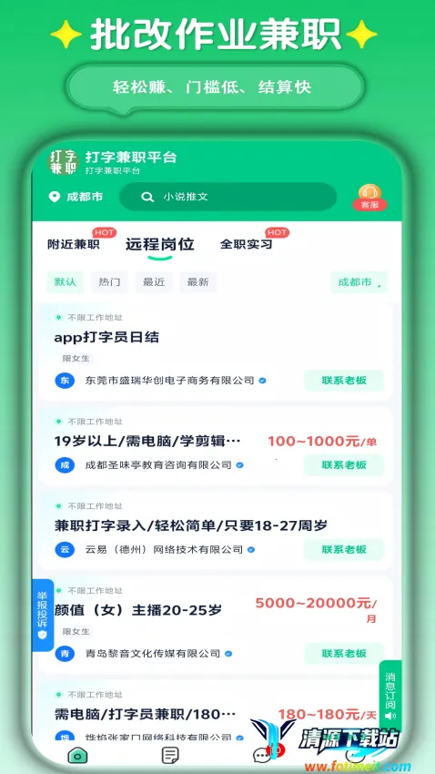 想找打字兼职平台吗?这里为你推荐一款超棒的打字兼职平台 app。它能提供海量兼职岗位招聘信息,让你轻松找到适合自己的兼职。你可以查看不同兼职岗位详情,了解工作内容。不管是同城的线下打字兼职,还是线上的,都能快速获取。还能通过关键词搜索感兴趣的兼职,加入本地兼职群获取每日兼职信息。平台不仅有打字兼职,其他兼职种类也很丰富。而且会给你推荐精品靠谱的兼职工作,商家都经过认证,确保信息真实安全。在这里,你能合理利用空闲时间,轻松实现空闲变现。发现合适兼职后,能快速联系商家报名参与。有了它,找兼职变得更容易,不同岗位动态随时掌握,让你轻松开启兼职赚钱模式,快来下载吧!