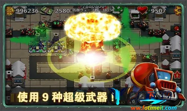 2. 武器多样:有多达16种防御塔,如加特林机枪塔、火箭炮塔等,还能使用空袭、核弹等多种超级武器。
