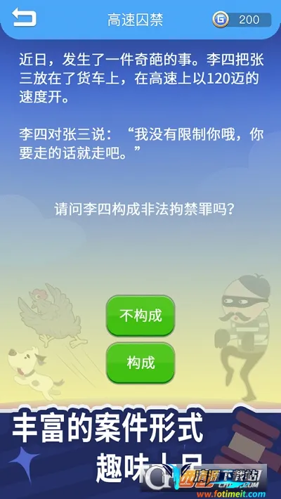 《法外无狂徒》是一款超有趣的法律科普游戏。它以趣味对话、简单问答形式,让玩家扮演学艺不精的律师审办各类案件。比如张三借摩托给李四,李四不还,张三夜晚偷回,玩家就得判断张三行为是否犯罪。游戏内容超丰富,有海量爆笑案件等你处理,能感受多样乐趣。故事情节有趣又有挑战,能让你学到很多实用法律知识。操作简单,轻松就能学习法律。在这里,你可以通过文字剧情闯关,点击屏幕查看案件,选择答案,答错重来。还有图片案件可依图选答案,不懂还能看广告解释。它不仅能让你在游戏中轻松掌握法律法规,还能锻炼思维能力,突破游戏锻炼大脑灵活性,快来下载体验吧!
