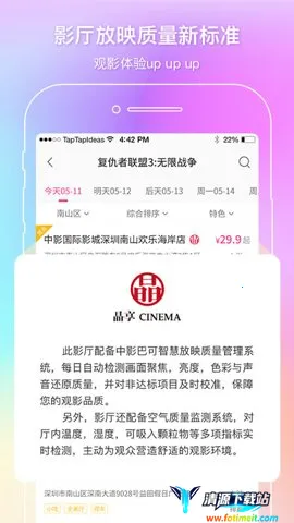 想轻松购买电影票?中国电影通app就能满足你!它是一款超棒的电影服务软件,能解决你买电影票的烦恼。这软件覆盖全国近9000家电影院,不管在哪,都能方便地买到票。它会根据你手机的GPS定位,推荐附近的影院,节省你的时间。线上选座购票超便捷,还支持线下自助机取票。而且有丰富精彩的特惠活动,像每周低至19元的抢票活动,让你能花更少的钱看更多好电影。会员还有专属定制的购票特权,享受更多优惠。电子券、红包、会员卡、中影通卡等都整合在钱包内,方便查找和使用。在这里,你能轻松一键选到黄金座位,摆脱选择困难症,还能了解详细的影视资讯,掌握更多电影相关内容,快来下载体验吧!