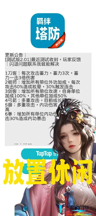 羁绊塔防是一款自由升级不删档的卡牌 TD 塔防游戏,挂机与自由自定义 RPG 结合。有 15 种羁绊、6 大系别,可通过转生获新力量构建阵容,玩法多样,能解锁图鉴、搭配武器,轻松挂机畅玩。