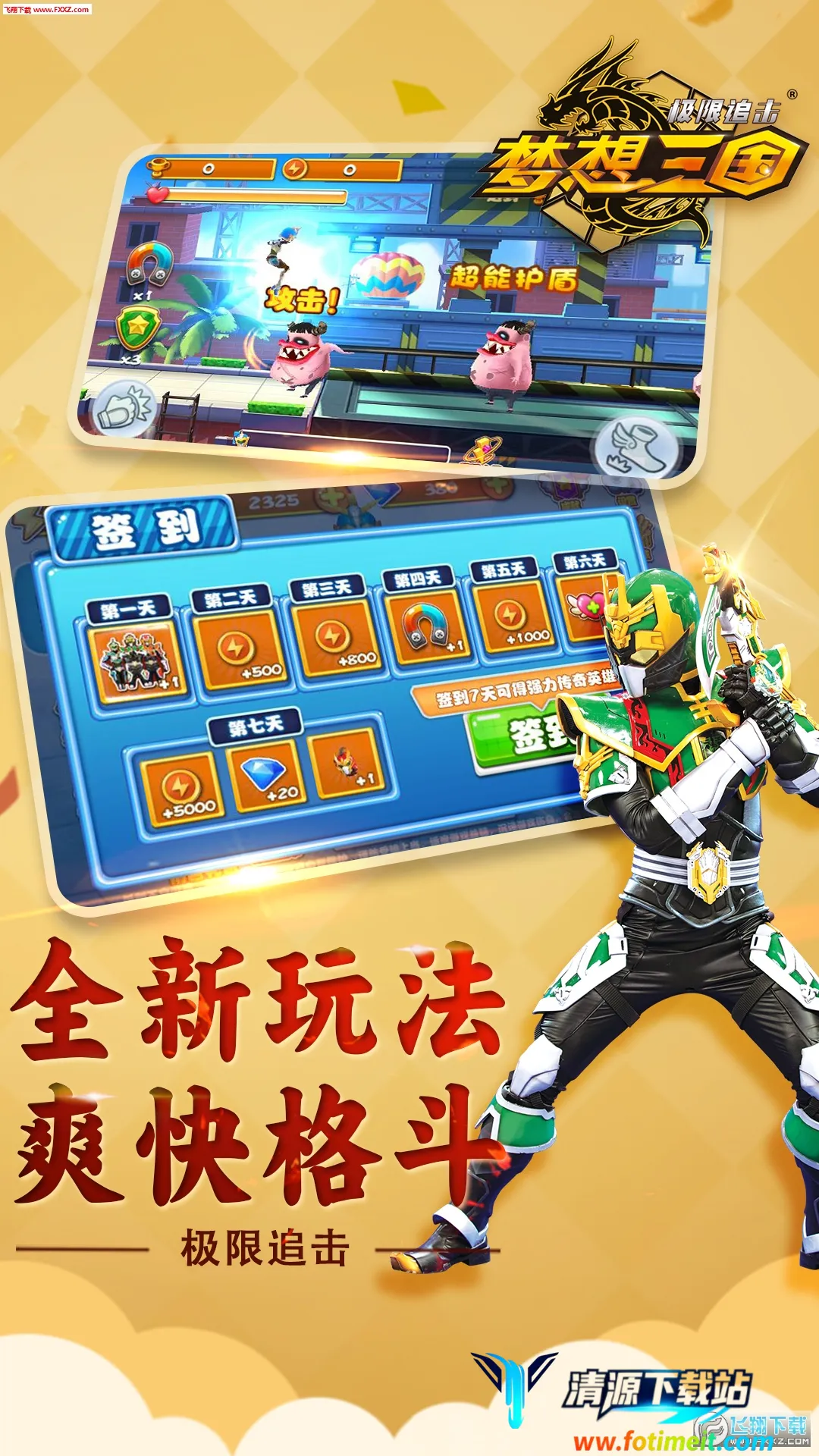 《梦想三国极限追击》玩法超有趣!这是一款基于梦想三国IP正版授权的3D横版动作冒险游戏。玩家能化身帅气的三国传奇英雄,为争夺梦想之力开启冒险。在关卡里,要不断跳跃躲避障碍,消灭怪物获取金币。通关就能获得奖励,用来提升角色各项属性。游戏场景简单清新,成功躲避障碍还会加分。精心设计的跑酷关卡,精致多样的场景,新奇的怪物造型,原声配音音乐,酷炫打击特效,带来惊险刺激的关卡体验。它把跑酷和格斗完美结合,有高清3D视觉效果,正版品质超棒。炫酷机甲搭配三国剧情人物,颠覆传统设计。搭配生动背景音乐,让你体验热血沸腾的格斗跑酷之旅,带你进入梦想三国的神奇世界,满足你对三国题材游戏的期待,快来试试吧!