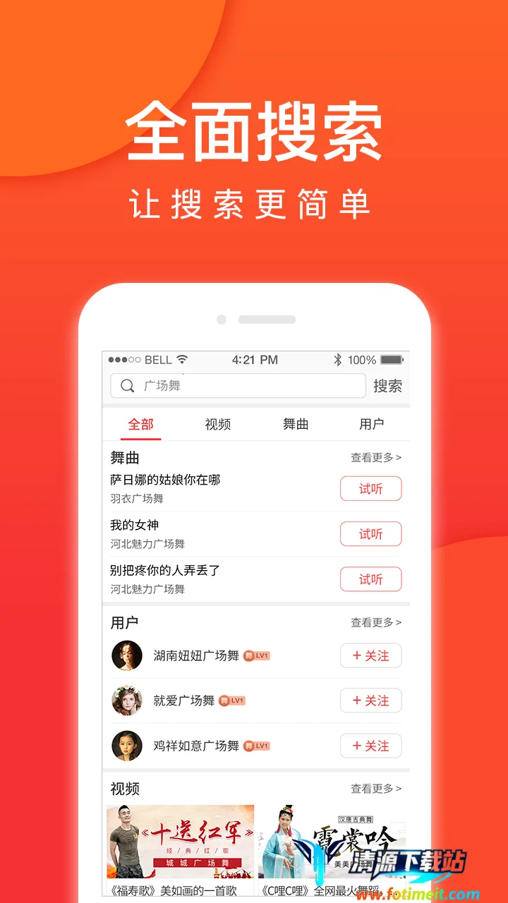 精准分类:所有广场舞内容精准分类,能让用户迅速找到心仪舞种,大大节省搜索时间,有效提高使用效率。