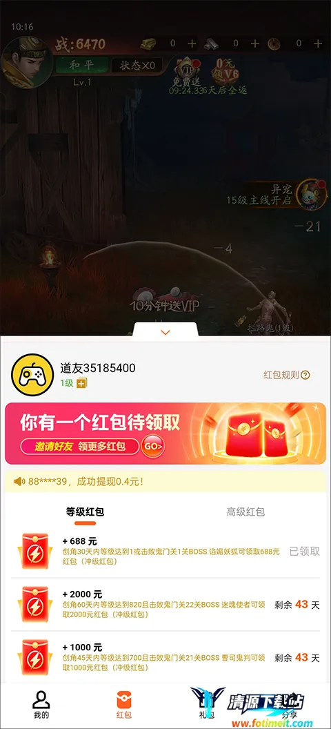 1、进入将魂师折扣版游戏内玩家就可以领取688冲级红包。