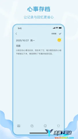 暗恋日记为怀揣暗恋心事的用户提供安全私密空间,助其记录珍贵心动瞬间。每条记录可添加场景备注,通过心动标签标注情绪状态,便于日后回顾,理解情感变化,沉淀情愫成珍贵记忆。用户能随时翻看暗恋对象合影或独自欣赏的美好瞬间,私密心动相册可上传照片。其优势在于有效保障隐私安全,有浪漫主题模板可个性化设置,让记录更愉悦有创意。能帮助用户更好地反思理解自身感受,在暗恋路上更从容自信。无论是初次相遇的怦然心动,还是日常细微感触,它都能妥善存放,成为心灵深处的守护者,留存每一份纯粹的喜欢。