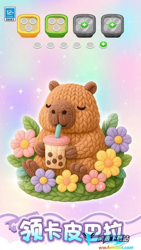 2、可爱的卡皮巴拉正在喝着的珍珠奶茶,周围出现了不同颜色的花朵,需要点击黄色花朵、白色奶茶。
