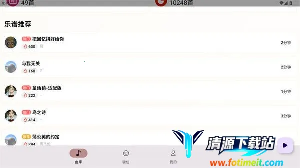 多元乐谱管理:内置多风格音乐资源库,涵盖流行、经典及游戏原声等类别,并持续更新热门新曲。用户还可自主创作乐谱并上传共享,或直接导入现有乐谱文件如MID格式,支持移调、音轨选择、乐器选择等精调操作。