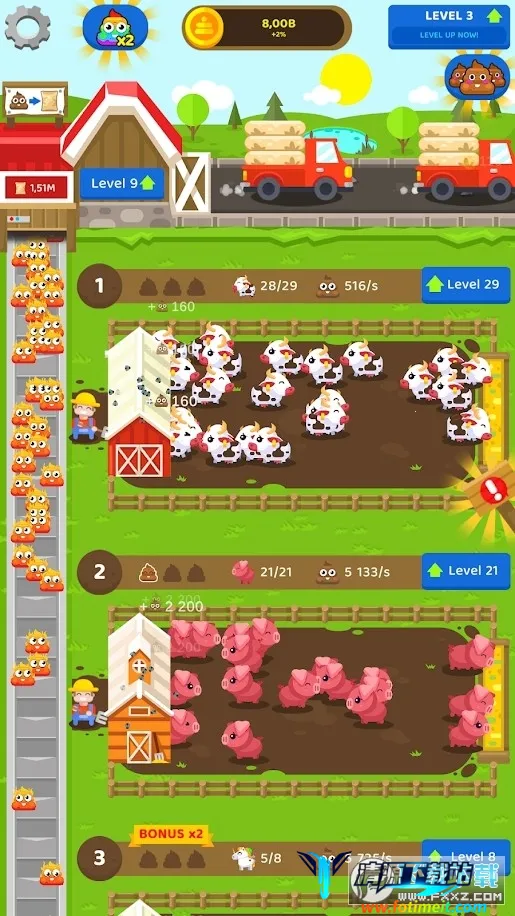 1、在游戏中,玩家将变身成为农场老板,你的任务就是通过增加农场养殖来收集“便便”,自动化的流水线肥料加工厂将会运输这些动物们的排泄物到肥料加工厂,随着运输车队会自动将这些加工好的肥料进行出售。