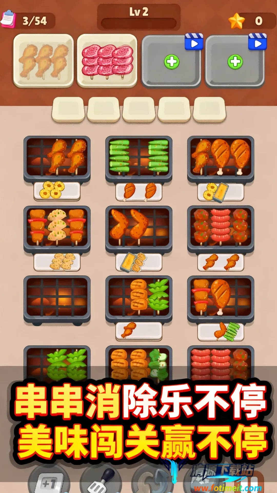 游戏玩法简单,点击相同食材即可消除并获积分,同时收集食材制作烧烤大餐。关卡设计层层递进,从基础消除到特殊障碍,难度渐升,持续激发解谜热情。限时外卖模式紧张刺激,考验反应与决策能力。随着关卡推进,可解锁更多场景装饰,自由装扮烧烤摊位,打造专属乐园。