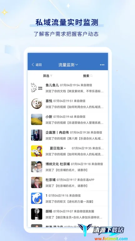 乐语集成了获客、管客、养客、裂变四大核心功能。可轻松监控私域流量,快速了解客户需求,增强客户互动。还能进行商务社交和市场推广,提升销售业绩。比如能快速撰写带广告的营销软文并一键分享,管理会员卡积分等。