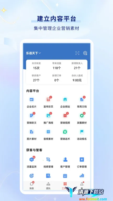 乐语是一款超棒的企业运营管理软件哦!它能帮你解决好多问题呢。它有快速撰写带广告营销软文并一键分享到社交网络的功能,还能管理会员卡积分和分销提现。一键备份手机通讯录,给好友分类或添加图文备忘录也很方便。收藏喜欢的手机网站或商城,能一键打开与分享。转发别人软文还能自动带自己广告。它的亮点也不少,有科学考核体系,能让运营过程高效。采用IOS友好界面,新增数据有红圈角标提醒,避免线索浪费。控制营销过程,各环节专人专岗。不管你是想提升品牌曝光度,还是高效管理客户资源,乐语都能满足你,给你的商业运营带来极大便利,快来下载体验吧!