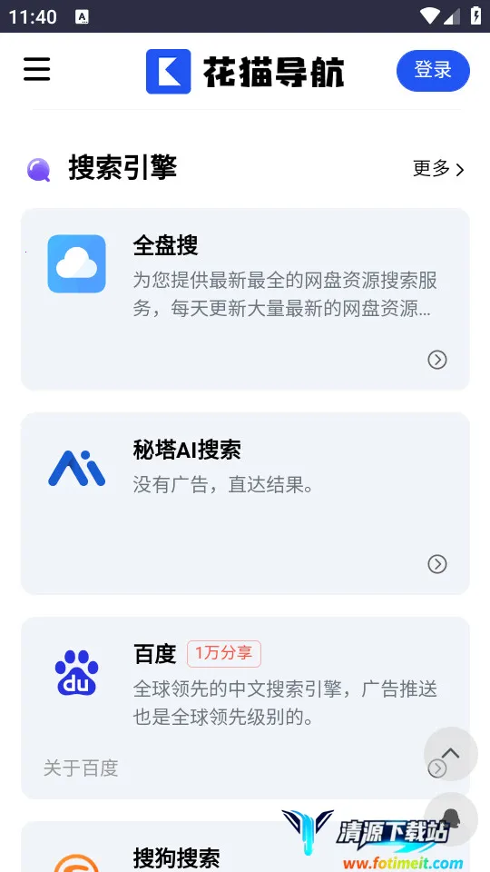 花猫导航是一款资源搜索软件,涵盖搜索引擎、休闲娱乐、工作办公等类别。它整合了多种搜索引擎,输入关键词即可筛选所需内容,影视、动漫、壁纸等资源均可免费查看。其搜索算法强大,能精准匹配关键词,快速定位种子资源。软件集成多个种子搜索引擎,结果丰富。新手和有经验的用户都能快速完成搜索任务。亮点包括省去注册环节,随时随地找种子资源;多个主流种子搜索引擎,确保搜索全面性;提供多种筛选和排序功能。优势有提供种子文件详细信息,可直接预览或下载;输入关键词,系统自动提取相关文件。总之,它能让用户便捷获取所需资源,带来畅快搜索体验。