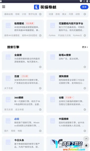 花猫导航是一款超实用的资源导航搜索工具。它整合了必应、谷歌、百度、搜狗等多种搜索引擎。使用时,只需在搜索框输入关键词,点击搜索,就能快速筛选出影视、动漫、壁纸、工具、小说、新闻、漫画等各类资源,而且全部免费查看。