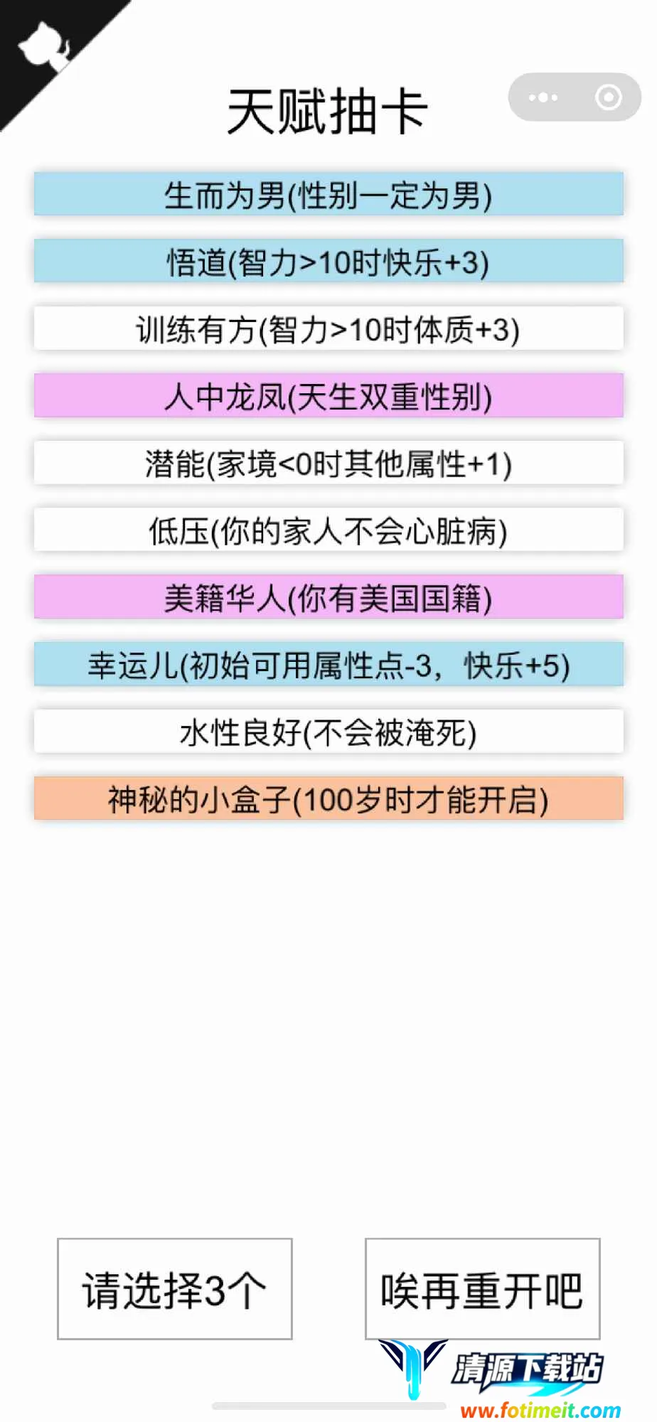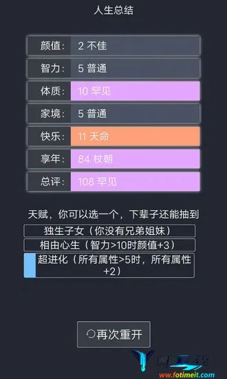 3. 属性影响人生:提供颜值、智力、体质、家境等多种初始属性,这些属性决定未来人生走向,增加了游戏的策略性。