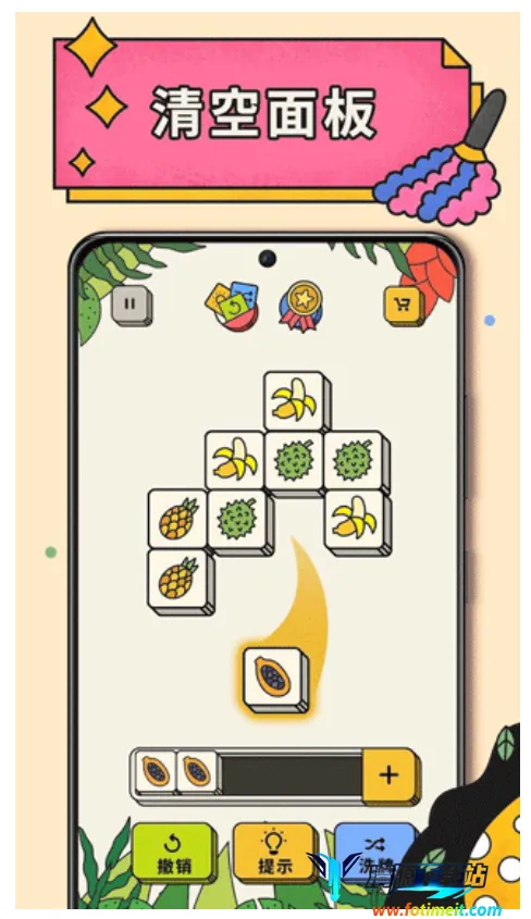 玩法乍看很简单。上面是一排排堆叠的方块(游戏介绍称之为“麻将”),下面是一个空槽,正好可以容纳7个方块。把上面三个相同的方块移到下面的空槽里,就可以把它们消掉(胡牌)。