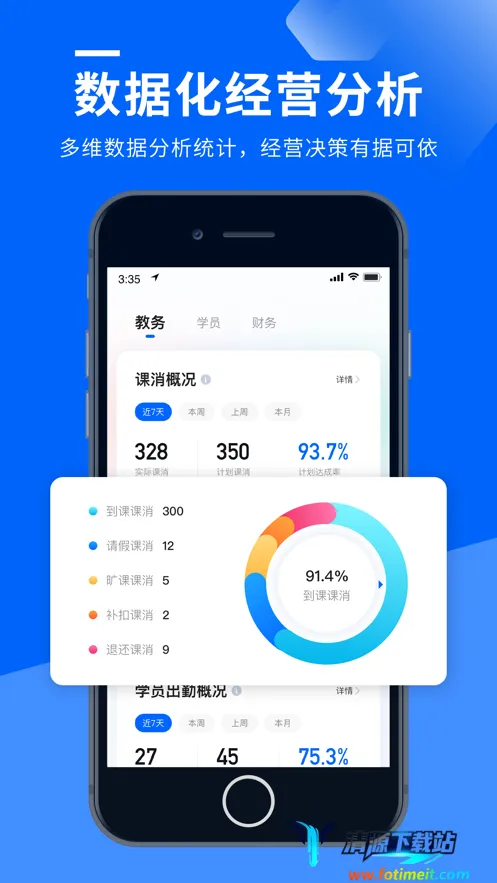 3、精细化教务管理:智能排课能自定义规则,自动检测冲突,操作便捷;支持手机刷脸考勤,适应多种课程场景;报名续费支持欠费注册、账户充值,一键关联打印机打印订单收据。