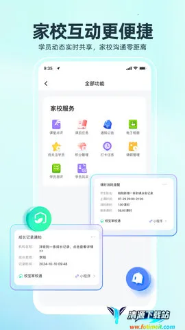 4、紧密家校互联:消息通知自动推送上课、退课、续课提醒,提升沟通效率;成长档案可个性化批量制作电子相册记录成长瞬间;课堂点评支持多种形式,家校互动更紧密。