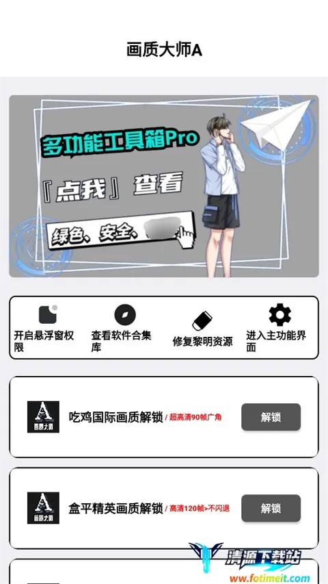 画质大师A正版2024是专为游戏爱好者打造的辅助工具,能调整游戏画面比例和画质,稳定帧数,让画面更真实细腻、运行更流畅。无需root权限,操作简单,支持多类游戏及安卓系统机型。