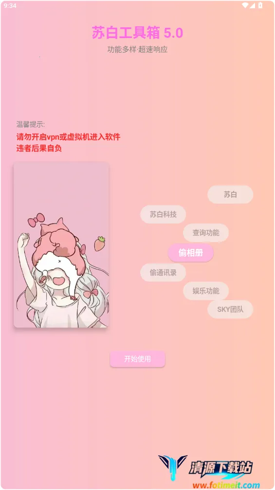 苏白工具箱是一款超实用的手机软件。它功能强大又丰富,能解决不少手机使用难题。比如一键清理缓存垃圾,让手机运行更流畅;还有便捷的Q绑查询服务,帮你快速知晓QQ账号绑定了哪些第三方应用。它的照妖镜功能可查验一些信息,规避风险。备份相册功能能确保照片资料安全,视频去水印功能可去除视频水印,短视频解析下载功能能让你轻松下载无水印短视频。另外,它支持主流安卓设备,所有功能经严格测试,安全可靠。使用时,先从正规应用市场下载安装,首次打开授予权限、同意协议,点击激活登录并再次激活就能使用啦。操作简单,新手也能轻松上手,能为你带来一站式便捷高效的手机使用体验,无论是生活、工作还是游戏场景,都能派上大用场。