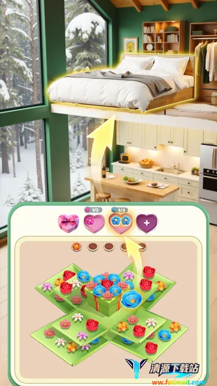 3. 高质量3D视角:将3D解谜与家居设计完美结合,全方位体验游戏细节,盒子与花朵精致,旋转视角感受空间变化与美丽延展。