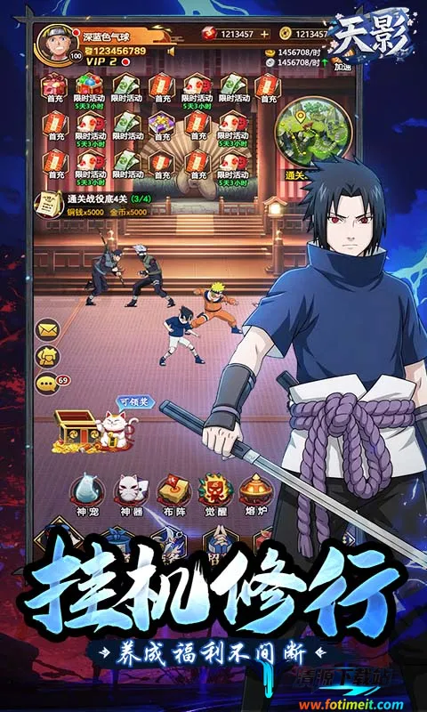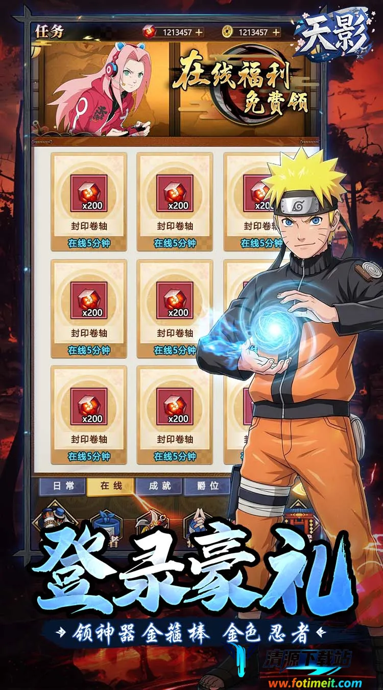 3. 丰富福利活动:全场充值0.1折,登录领神器、金将忍者,等级福利狂送400抽,超值首充还有九尾之子降临,让玩家能轻松畅享游戏。